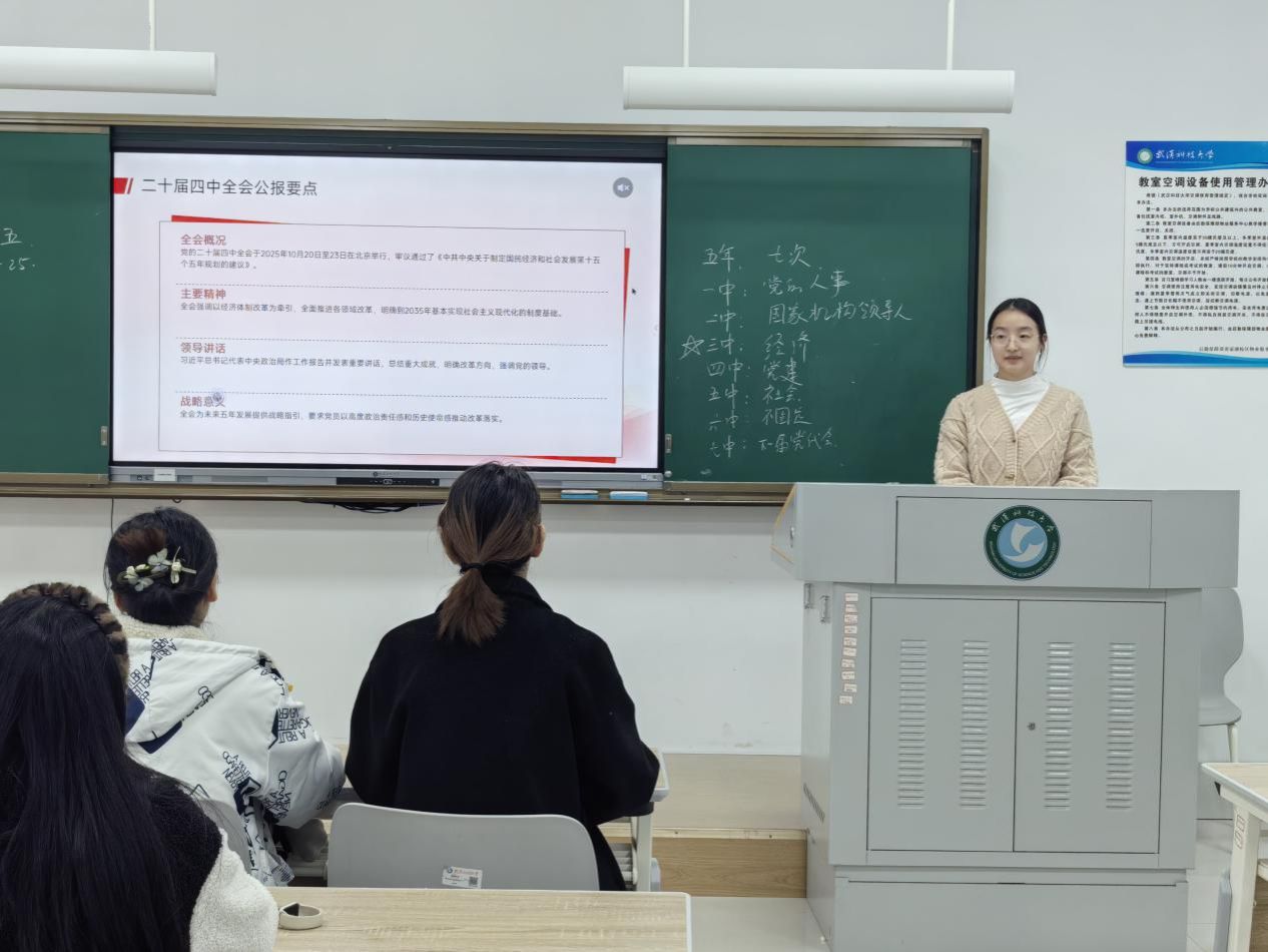 在专题学习环节,党员代表杨晨围绕“学习贯彻党的二十届四中全会精神”进行了领学。她详细介绍了全会于2025年10月20日至23日在北京举行的基本情况,重点阐述了全会听取和讨论习近平总书记工作报告、审议通过《中共中央关于制定国民经济和社会发展第十五个五年规划的建议》的重大成果,并表示:“作为新时代的大学生党员,我们必须第一时间学习掌握中央最新精神,深刻认识‘十五五’时期面临的机遇与挑战,将个人成长融入国家发展大局,为学校发展和地方建设贡献智慧。”