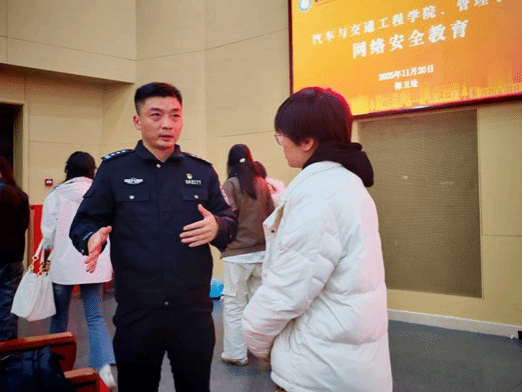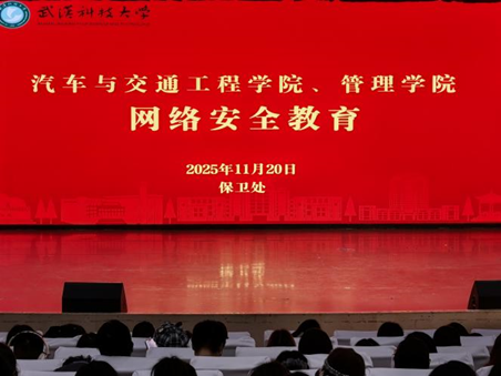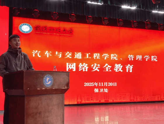 (通讯员:宋徐金鑫)11月20日,我们与汽车与交通工程学院在沁湖礼堂联合举办2025级本科生网络安全教育宣讲大会,本次大会特邀保卫处治安科副科长刘承武担任主讲嘉宾,我们2025级本科生辅导员葛红涛出席本次会议,我们与汽车与交通工程学院全体2025级本科生共同参与。汽车与交通工程学院2025级本科生辅导员张宇欣主持会议。