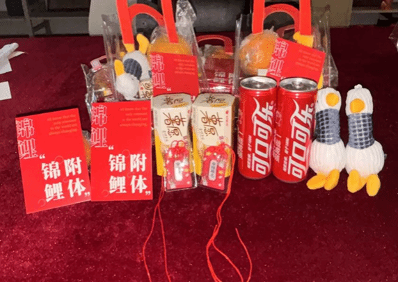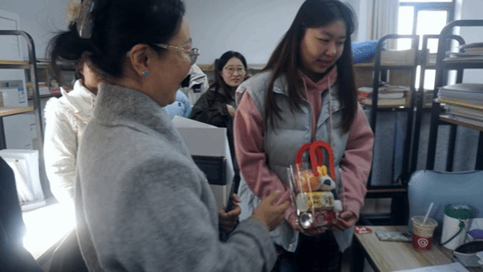 随后,学院领导与老师们将精心准备的福袋逐一发放到每位学子手中。福袋中满载着寓意美好的实用礼品:寓意“佳绩可乐”的可口可乐、承载“薯你心愿”的薯愿薯片、象征“心想事橙”的鲜橙,以及鼓励大家“加油呀”的可爱加油鸭玩偶。一份份礼物,承载着学院细致入微的关怀与真挚美好的祝愿。
