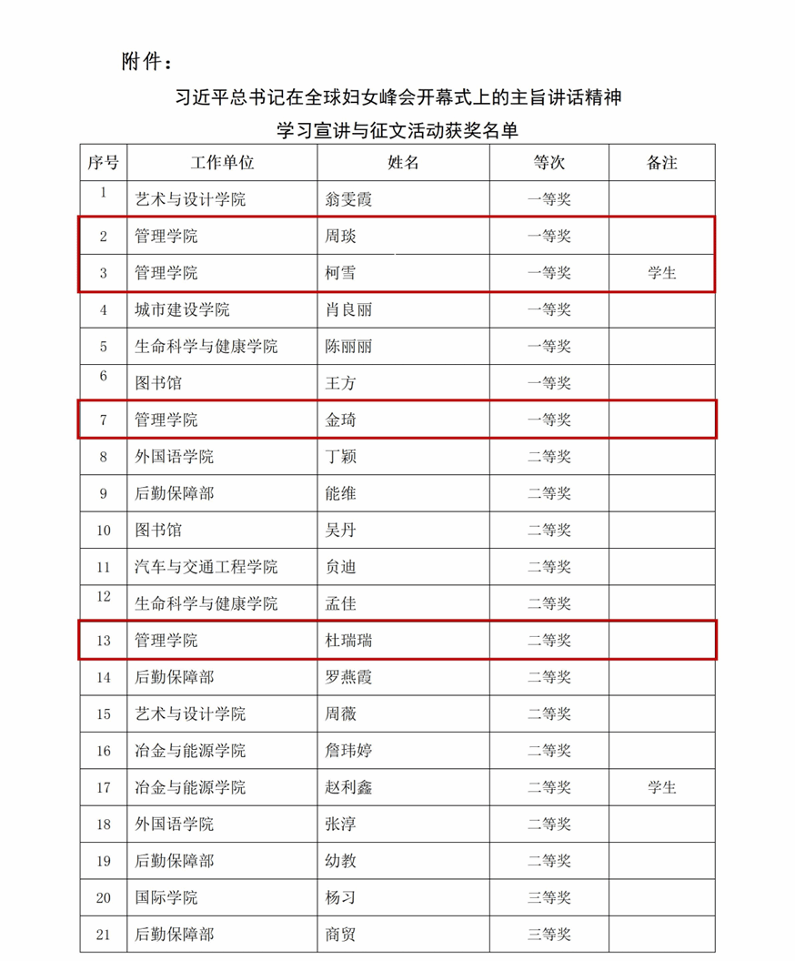 (通讯员:柯雪)1217日,我校围绕习近平总书记在全球妇女峰会开幕式上的主旨讲话精神学习宣讲与征文活动评选结果揭晓,经专家评审、校妇女委员会会议审定,最终评选出一等奖7篇、二等奖12篇、三等奖24篇。其中,我们师生表现突出,获一等奖3篇、二等奖1篇,深刻展现了我们师生扎实的理论学习功底和积极的进取精神。